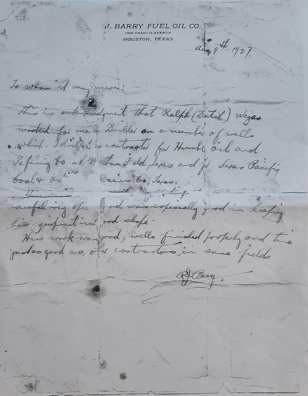 Although details are scarce, Jans seeks news about her great-great uncle Ralph “Dutch” Weges — who in 1962 reportedly returned to the Netherlands by ship. His petroleum-related career included serving on merchant vessels. Regarding his work in Texas, she has a 1927 letter of recommendation with some clues.